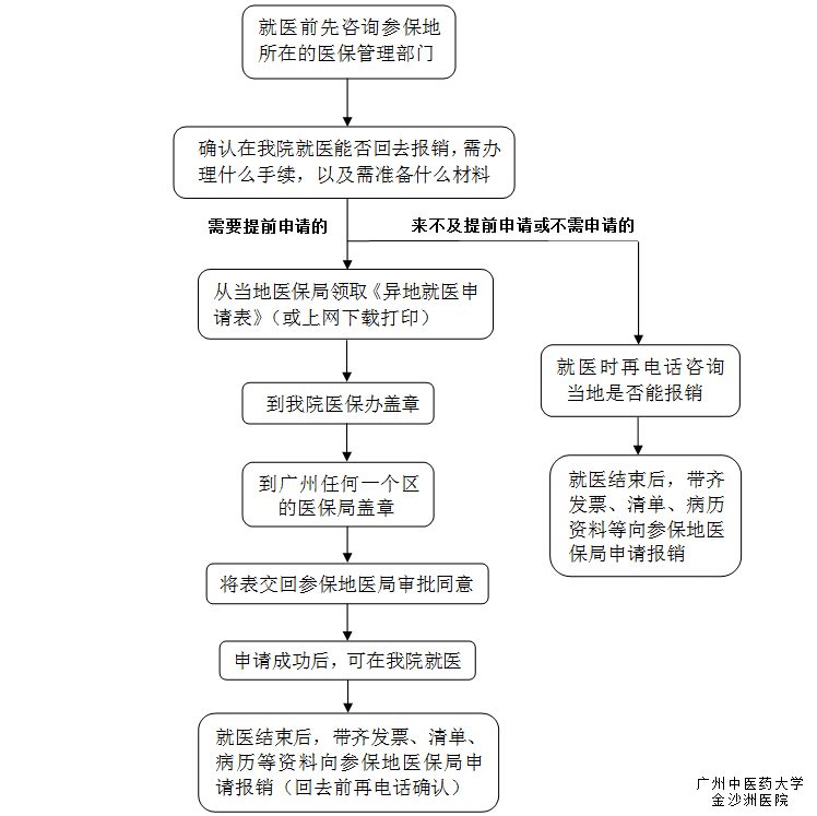 目前我院暂时只开通了广州医保即时结算,参加了广州市外的医保或新农合的人员可以按以下方式申请就医: